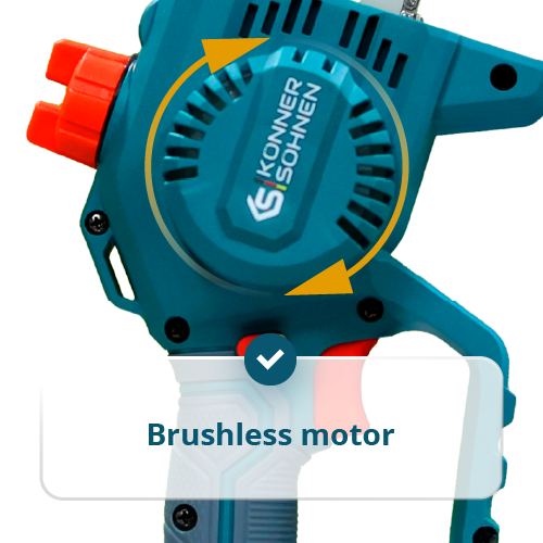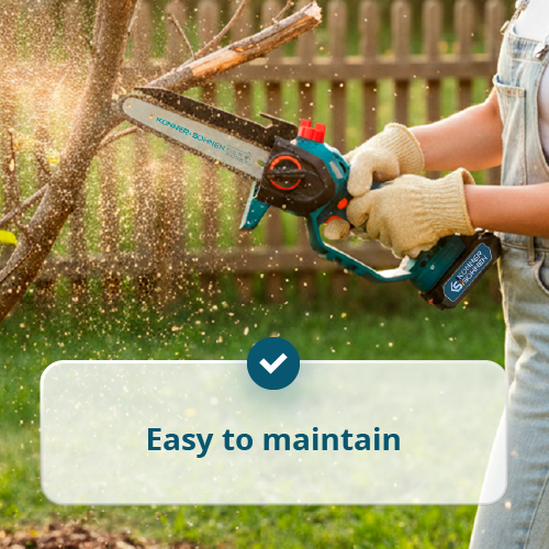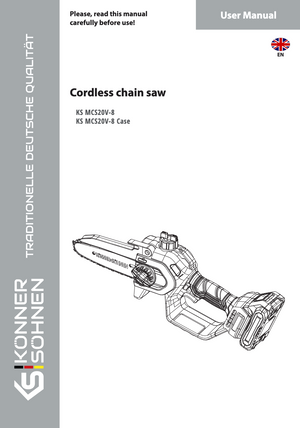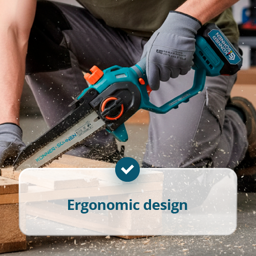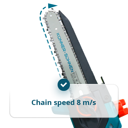The KS MCS20V-8 Case cordless mini chainsaw from the German brand Könner & Söhnen with an 8” bar (20 cm) and 8 m/s chain speed is a powerful and quiet tool for garden work. The brushless motor with a 5-year warranty ensures reliable performance. The saw runs on a 20V battery included in the set, along with a charger, 2 bars, and 2 chains. Ergonomic handle, protective guard, safety lock button, and top cover ensure safety. Quick chain tensioning mechanism and automatic lubrication simplify maintenance. A safety strap loop enables secure work at height. Ideal for branch trimming and tree care.